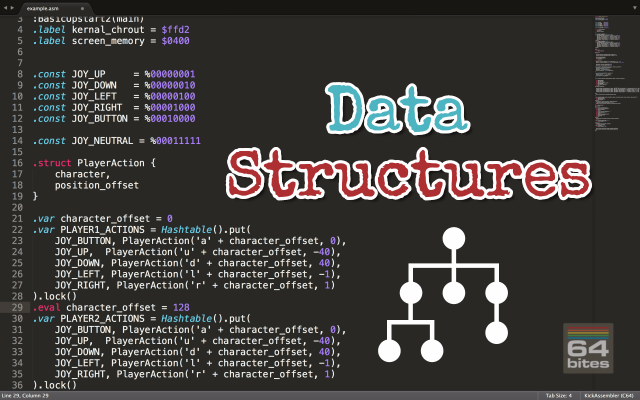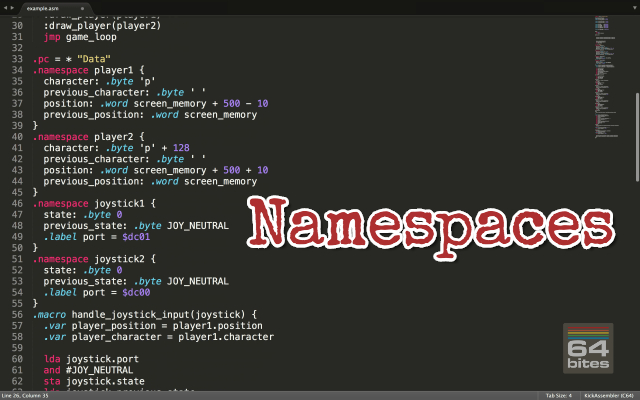Some languages provide structures or records to group data at runtime. Surprisingly KickAssembler's namespaces can be used in a similar manner. We can use them to group data together and pass them ... Read more →