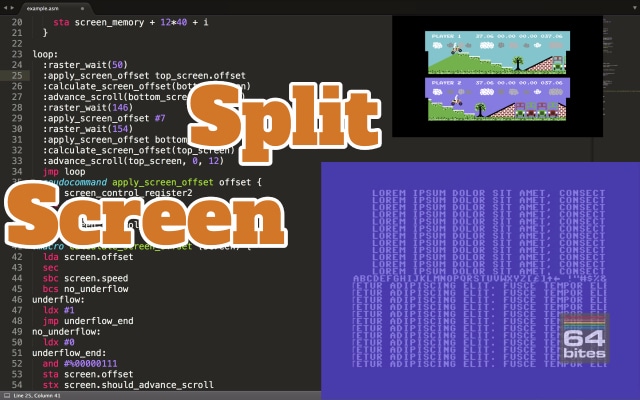 Many two-player games on Commodore 64 split the screen horizontally and present separate view for each player. Today we are going to do it ourselves. We are going to make two horizontal parts of ... Read more →